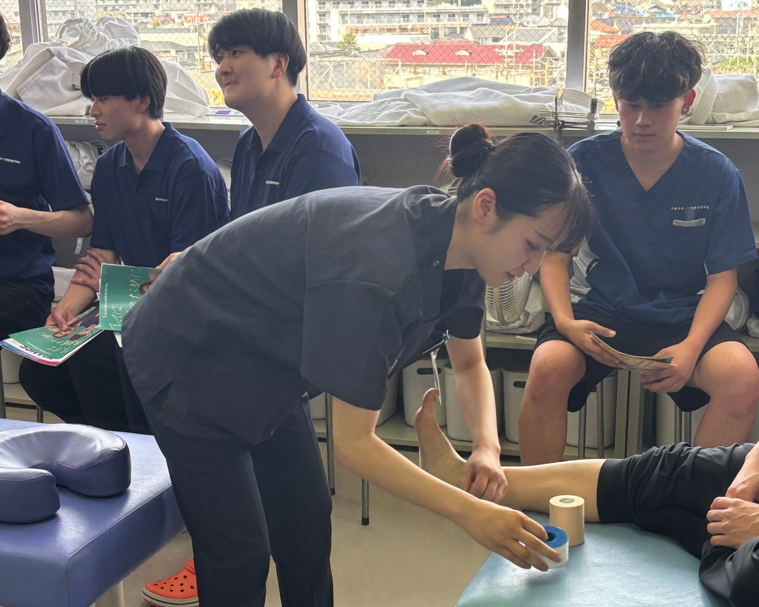 柔道整復師ならではの包帯やテーピングを巻く授業では、普段経験することが出来ないことなので、楽しさとやりがいを感じます。昨年はスポーツ大会も無事に開催することができました。他学年の学生とも協力し合いながら、体を動かすことが出来る楽しい行事でした。